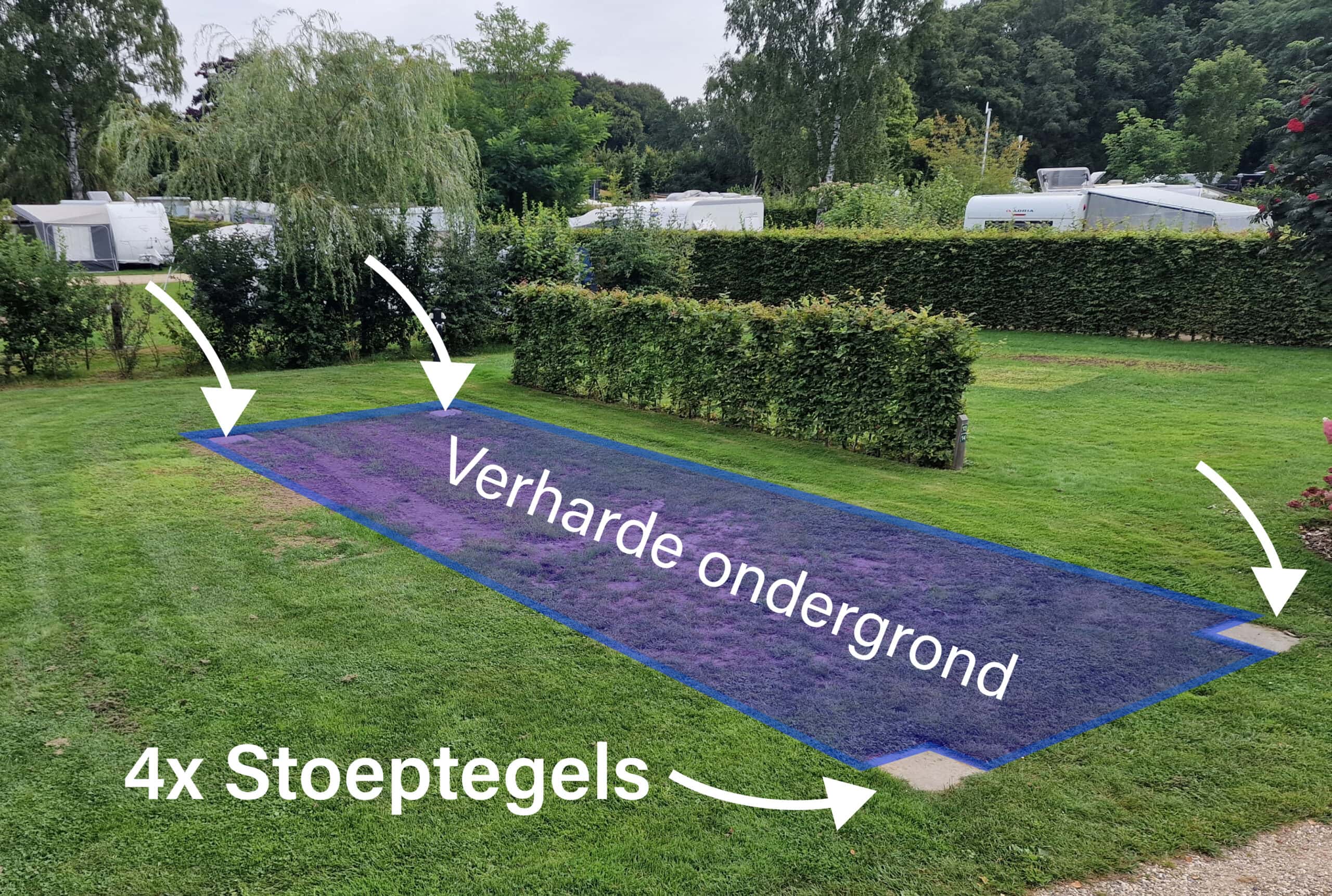 Jeder Stellplatz hat ein gepflastertes Rechteck (unsichtbar unter dem Gras), mit einer Ecke vier Pflastersteine.